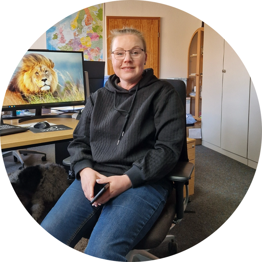 "Slow down!" isn't in Marion's vocabulary. Our Mrs. "Let's go!" doesn't waste any time, but skips the first three courses. Anything else would be boring and a waste of time. But don't worry, she doesn't neglect her meticulousness and orderliness. And when she's not taking care of things like deliveries and returns, she enjoys spending her afternoons and weekends in the fields and woods, enjoying nature with her dog and everything that comes with it. After all, her batteries need to be recharged sometimes.